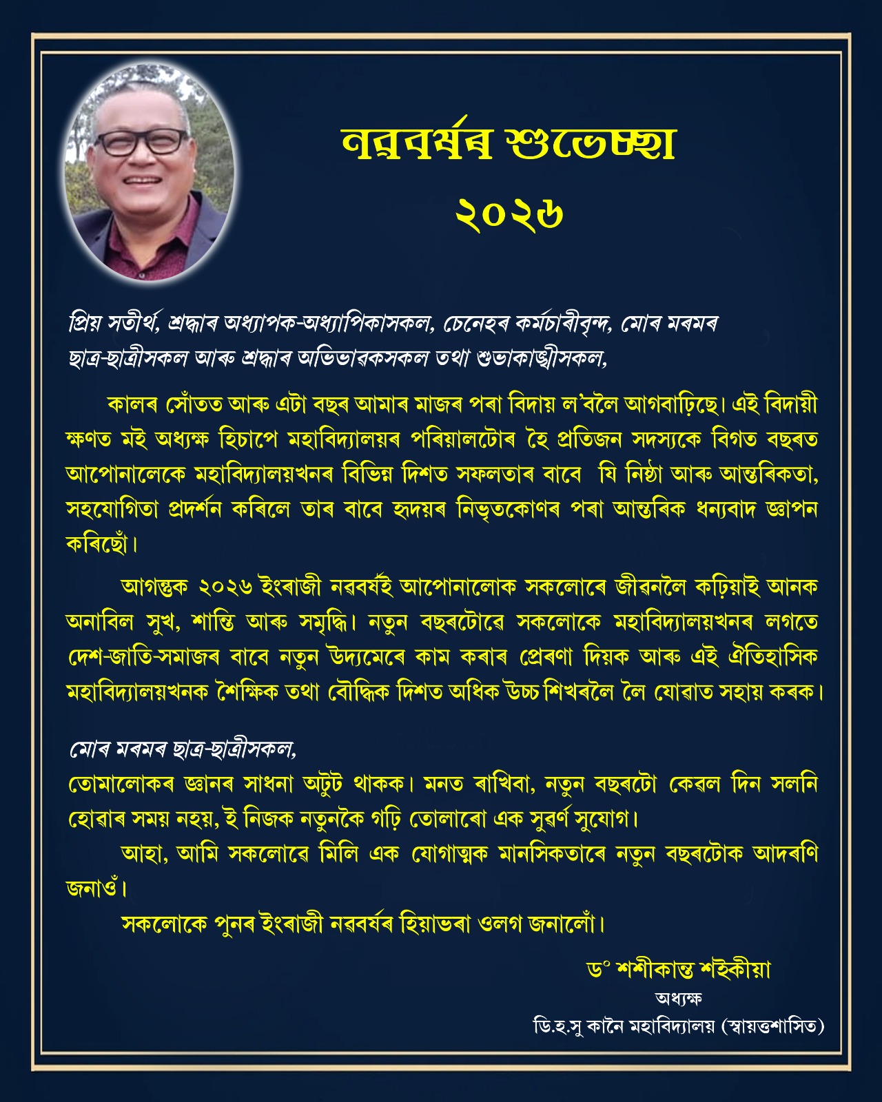 DHSK College, Dibrugarh was established on 15th June, 1945 with a vision: Gyanat Paratarang Na Hi (Nothing Better than Knowledge) to cater to the needs of higher education in upper Assam. At the inception, the college was affiliated to the Calcutta University, later in 1948 it was affiliated to the Gauhati University. The college was instrumental for conceptualisation and subsequent establishment of Dibrugarh University in 1965, and the College, at present takes pride in its affiliation to this University. A concrete mission of this institution is to transform the younger citizens of this remote part of our country into responsible individuals.